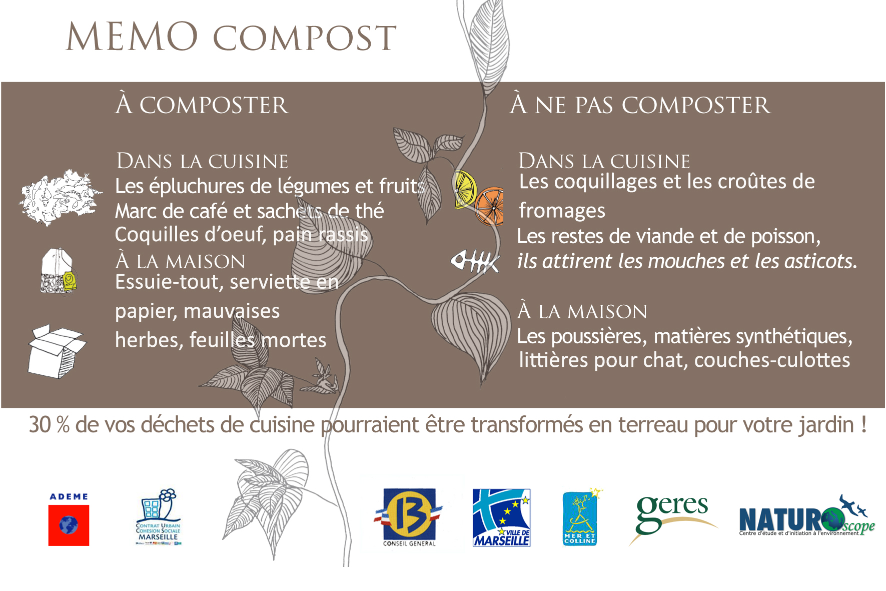 Dans le cadre du « Réseau Compostage au Jardin », la Maison de la Nature a aménagé une aire pédagogique de compostage permettant d’accueillir tous les publics pour des ateliers ludiques et gratuits de découverte des techniques de compostage. Ce projet, piloté par l’association GERES et soutenu par L’ADEME et le Conseil Général des Bouches du Rhône, nous permet de mettre en place des ateliers mensuels, tous les 1ers mercredi du mois à 16 h, à destination de toutes les personnes désirant se mettre au compostage ou améliorer leurs méthodes. Vous êtes un groupe de voisins intéressés pour être formés au compostage, contacter-nous au 04 91 75 58 43 ou au 06 22 45 44 02, nous vous organisons un atelier spécifique.