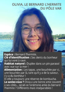 Sourire aux lèvres, vous pourrez croiser ses pinces et sa coquille, au bord de l’eau ou sur les sentiers provençaux, à tailler des oliviers, danser sur « Get lucky » tout en mangeant des tapas ! D’origine polonaise, cette médiatrice polyglotte se lance dans la langue des signes (pas si facile avec 2 pinces !).